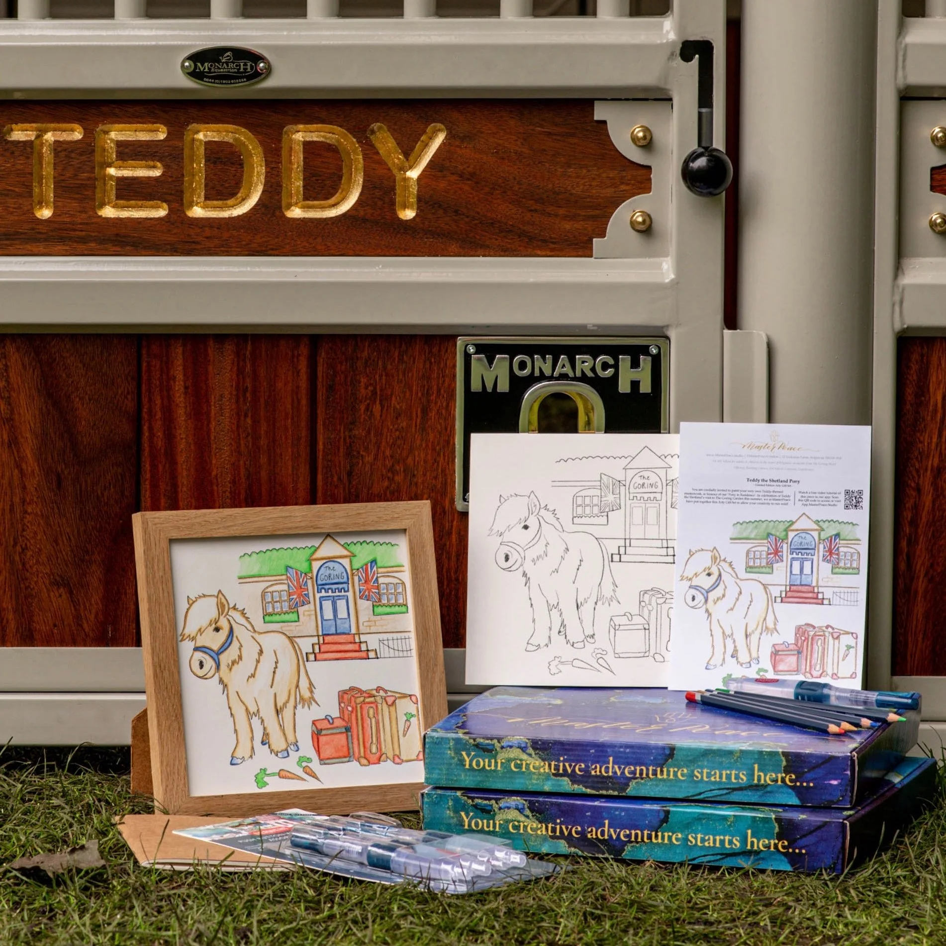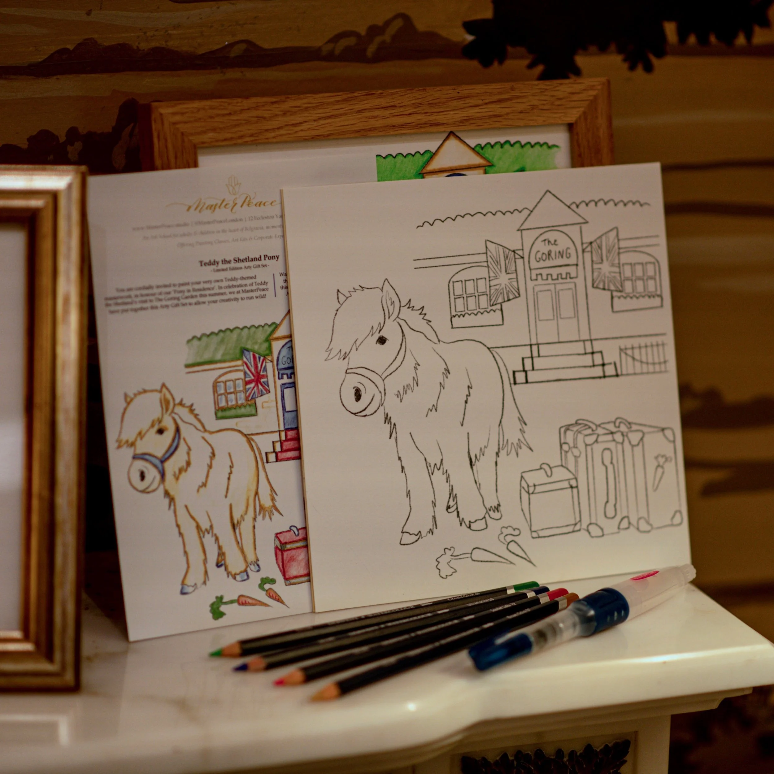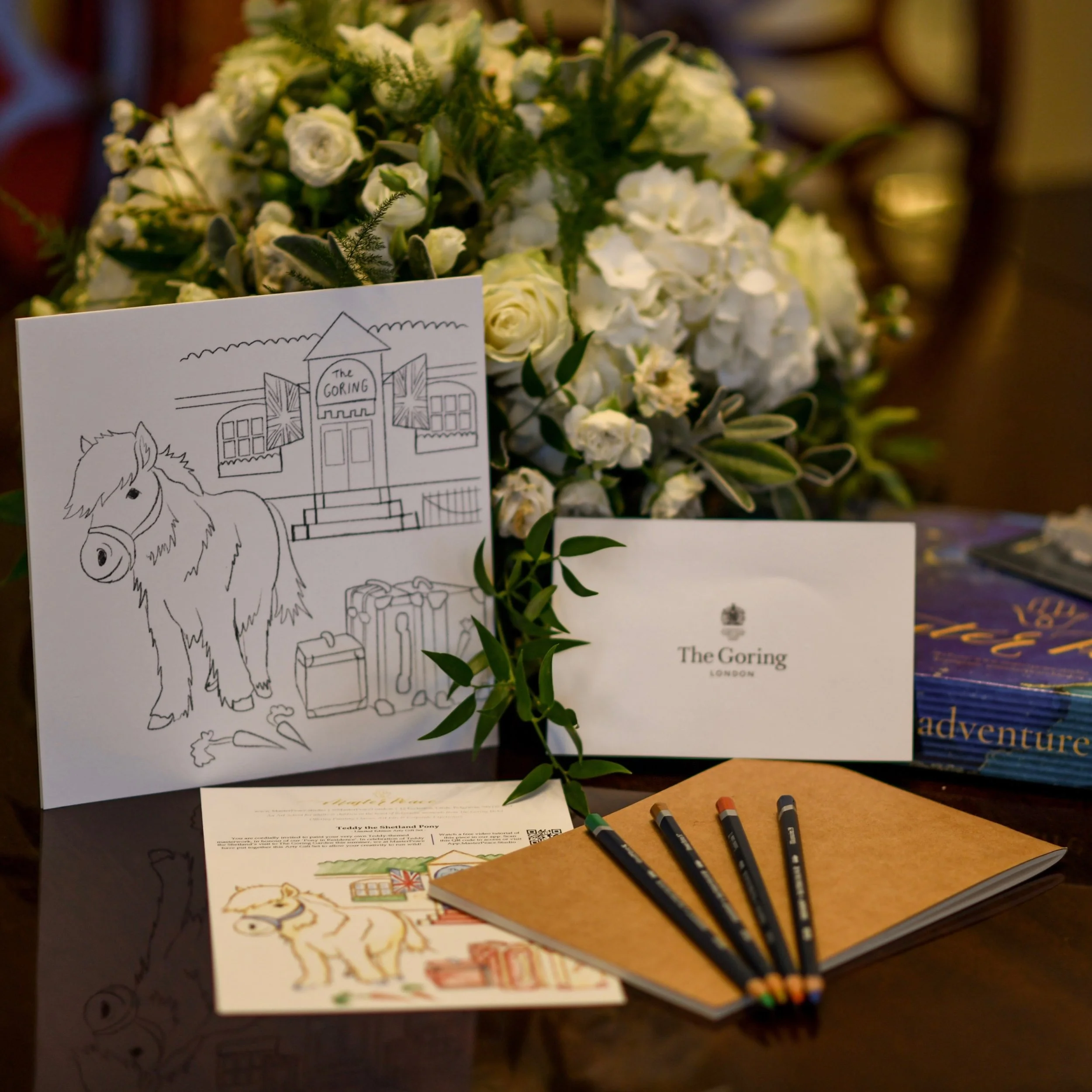 In collaboration with MasterPeace Studios in London, I designed a promotional art kit to commemorate the visit of Teddy the pony at The Goring Hotel.